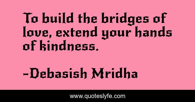 This page presents the quote "To build the bridges of love, extend your hands of kindness.". Author of this quote is Debasish Mridha. This quote is about extend-your-hands, love, build-bridges-of-love, philosophy, debasish-mridha, quotes, inspirational, enthusiasm, kindness,.