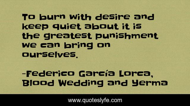 This page presents the quote "To burn with desire and keep quiet about it is the greatest punishment we can bring on ourselves.". Author of this quote is Federico García Lorca, Blood Wedding and Yerma. This quote is about desire, punishment, unrequited-love,.
