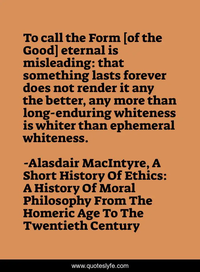 This page presents the quote "To call the Form [of the Good] eternal is misleading: that something lasts forever does not render it any the better, any more than long-enduring whiteness is whiter than ephemeral whiteness.". Author of this quote is Alasdair MacIntyre, A Short History Of Ethics: A History Of Moral Philosophy From The Homeric Age To The Twentieth Century. This quote is about ethics, plato, aristotle,.