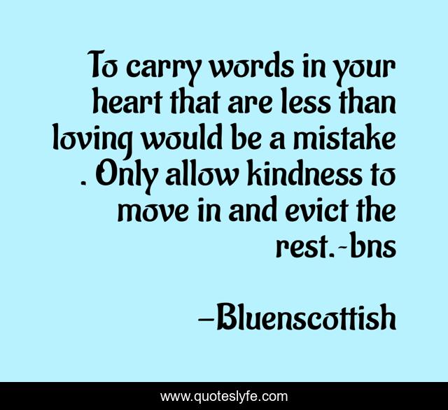 This page presents the quote "To carry words in your heart that are less than loving would be a mistake . Only allow kindness to move in and evict the rest.~bns". Author of this quote is Bluenscottish. This quote is about bluenscottish, kidness, love, commitment, affection,.