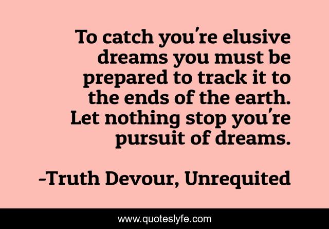 This page presents the quote "To catch you're elusive dreams you must be prepared to track it to the ends of the earth. Let nothing stop you're pursuit of dreams.". Author of this quote is Truth Devour, Unrequited. This quote is about faith, love, dreams, kindred-spirits, joy, karmic, soul, romance, twin-flames,.