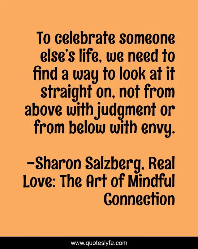 This page presents the quote "To celebrate someone else’s life, we need to find a way to look at it straight on, not from above with judgment or from below with envy.". Author of this quote is Sharon Salzberg, Real Love: The Art of Mindful Connection. This quote is about love, mindfulness, sympathetic-joy, meditation, real-love, non-judgment, affection, celebration,.