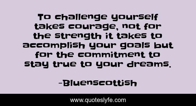 This page presents the quote "To challenge yourself takes courage, not for the strength it takes to accomplish your goals but for the commitment to stay true to your dreams.". Author of this quote is Bluenscottish. This quote is about courage, strength, success, challenges, leadership, bluenscottish, goals, true, dreams,.