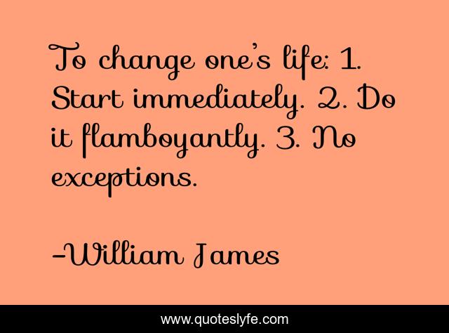This page presents the quote "To change one’s life: 1. Start immediately. 2. Do it flamboyantly. 3. No exceptions.". Author of this quote is William James. .