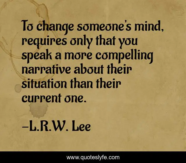 This page presents the quote "To change someone's mind, requires only that you speak a more compelling narrative about their situation than their current one.". Author of this quote is L.R.W. Lee. This quote is about life-philosophy, life-experience, life-lessons,.