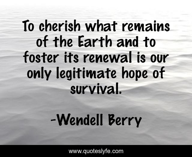 This page presents the quote "To cherish what remains of the Earth and to foster its renewal is our only legitimate hope of survival.". Author of this quote is Wendell Berry. This quote is about earth, survival, nature,.