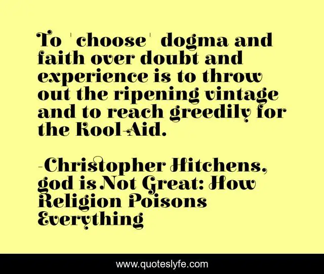 "Christopher Hitchens, god is Not Great: How Religion Poisons Everything Quotes." Quoteslyfe.com, 2025. Fri. 05 Dec. 2025. <https://www.quoteslyfe.com/quote/To-choose-dogma-and-faith-over-doubt-25643>.