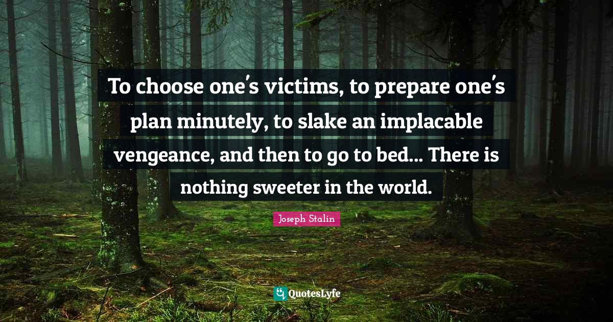 This page presents the quote "To choose one's victims, to prepare one's plan minutely, to slake an implacable vengeance, and then to go to bed... There is nothing sweeter in the world.". Author of this quote is Joseph Stalin. This quote is about world, bed, vengeance,.