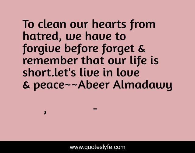 This page presents the quote "To clean our hearts from hatred, we have to forgive before forget & remember that our life is short.let's live in love & peace~~Abeer Almadawy". Author of this quote is عبير المعداوي, Ø§ØØ¶Ø§Ù† الشوك. This quote is about forgiveness, love, affection,.