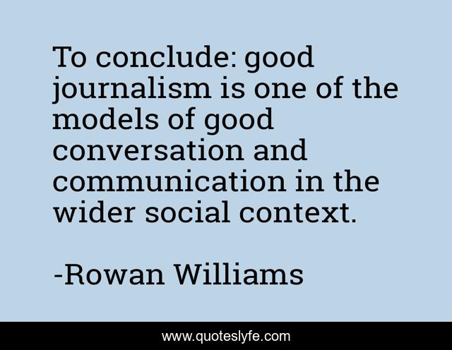 This page presents the quote "To conclude: good journalism is one of the models of good conversation and communication in the wider social context.". Author of this quote is Rowan Williams. This quote is about good, journalism,.