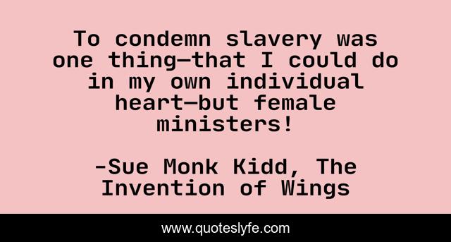 This page presents the quote "To condemn slavery was one thing—that I could do in my own individual heart—but female ministers!". Author of this quote is Sue Monk Kidd, The Invention of Wings. This quote is about irony, quakers, slavery,.