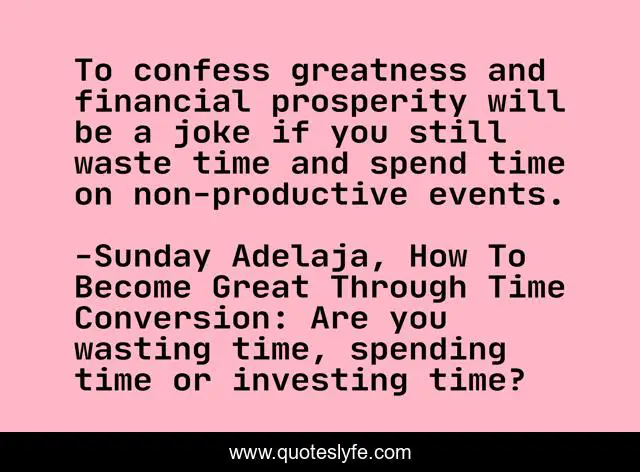 This page presents the quote "To confess greatness and financial prosperity will be a joke if you still waste time and spend time on non-productive events.". Author of this quote is Sunday Adelaja, How To Become Great Through Time Conversion: Are you wasting time, spending time or investing time?. This quote is about confession, life, prosperity, conversion, productivity, wealth, greatness, financial-prosperity, waste,.