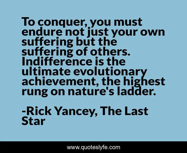 This page presents the quote "To conquer, you must endure not just your own suffering but the suffering of others. Indifference is the ultimate evolutionary achievement, the highest rung on nature's ladder.". Author of this quote is Rick Yancey, The Last Star. This quote is about evolution, endurance, suffering, conquer, endure, indifference,.