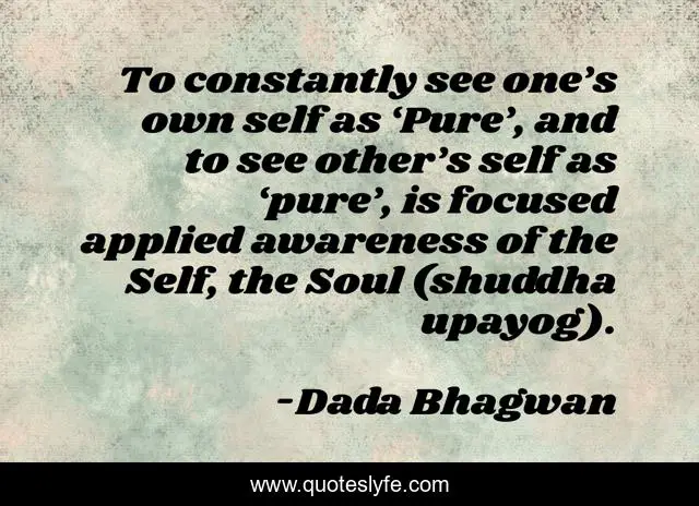 This page presents the quote "To constantly see one’s own self as ‘Pure’, and to see other’s self as ‘pure’, is focused applied awareness of the Self, the Soul (shuddha upayog).". Author of this quote is Dada Bhagwan. This quote is about shuddha-upayog, spiritual, self, purify, soul, purity, pure, atma, awareness,.