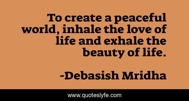 This page presents the quote "To create a peaceful world, inhale the love of life and exhale the beauty of life.". Author of this quote is Debasish Mridha. This quote is about peaceful-world, yoga, philosophy, debasish-mridha, quotes, debasish-mridha-md, inspirational, enthusiasm, beauty-of-life,.
