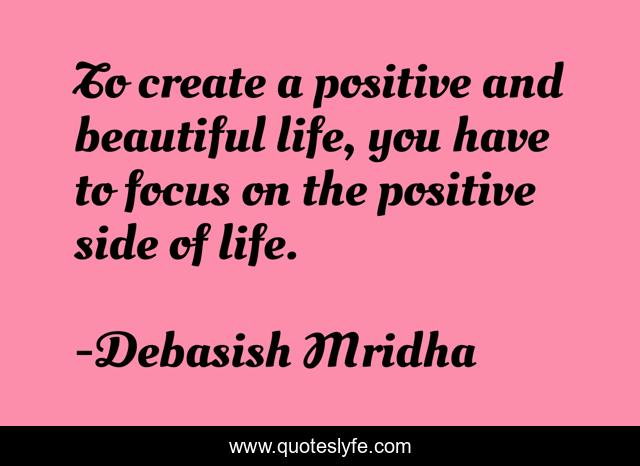 This page presents the quote "To create a positive and beautiful life, you have to focus on the positive side of life.". Author of this quote is Debasish Mridha. This quote is about miraboli, beautiful-life, oscar-wilde, focus-on-the-positive, philosophy, debasish-mridha, tagore, debasish-mridha-md, quotes,.