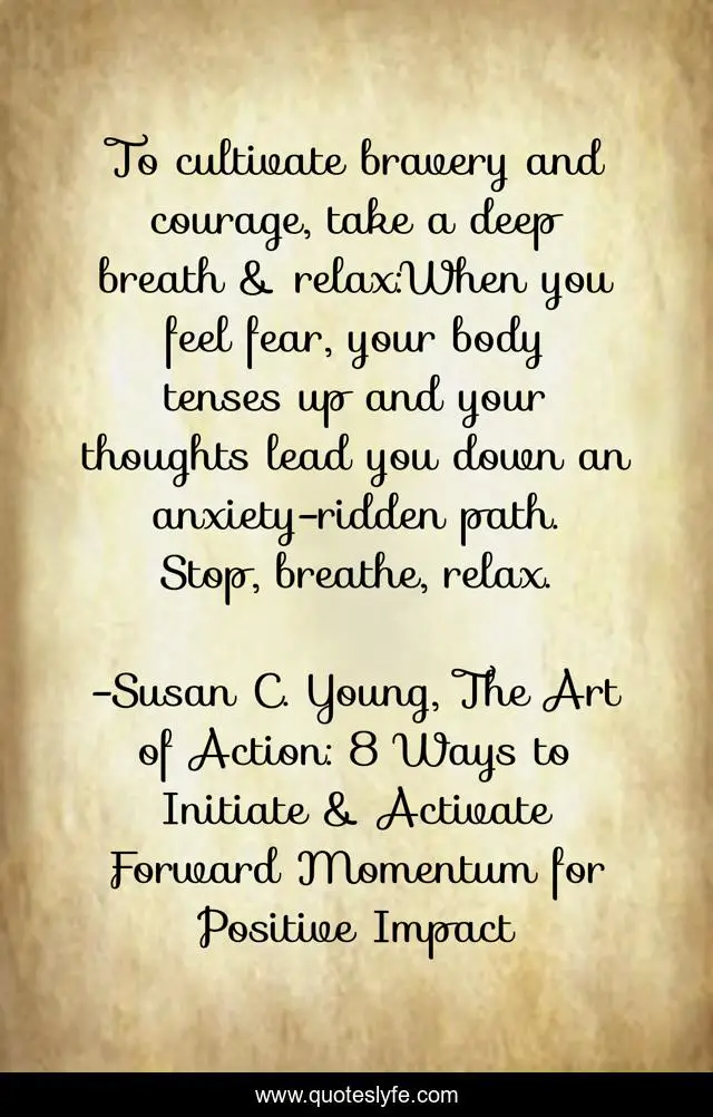 This page presents the quote "To cultivate bravery and courage, take a deep breath & relax:When you feel fear, your body tenses up and your thoughts lead you down an anxiety-ridden path. Stop, breathe, relax.". Author of this quote is Susan C. Young, The Art of Action: 8 Ways to Initiate & Activate Forward Momentum for Positive Impact. This quote is about relationship, communication-skills, emotional-intelligence, positive-first-impression, quotes-by-susan-c-young, susanspeaks-com, conquer-fear, motivational-speaker-susan-young, bravery,.