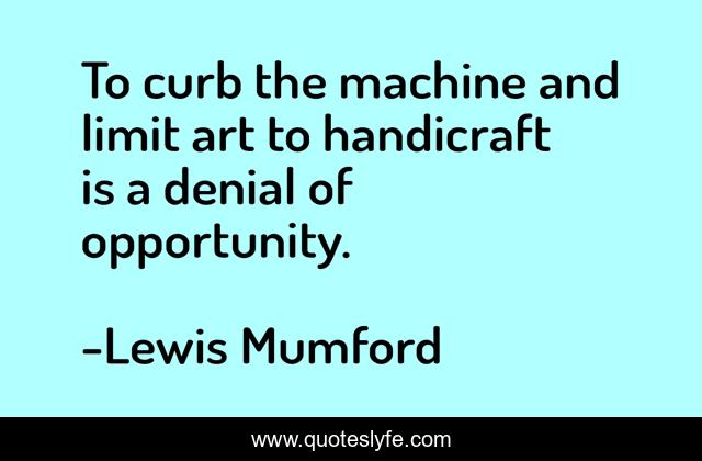 This page presents the quote "To curb the machine and limit art to handicraft is a denial of opportunity.". Author of this quote is Lewis Mumford. This quote is about machine, opportunity, limit,.