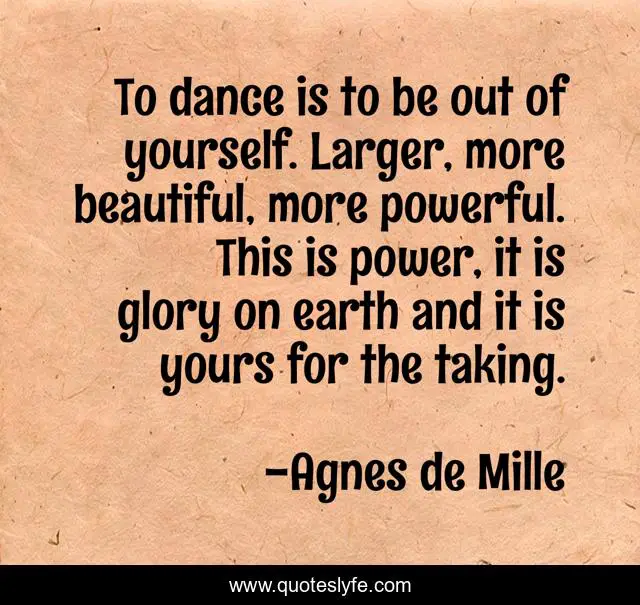 This page presents the quote "To dance is to be out of yourself. Larger, more beautiful, more powerful. This is power, it is glory on earth and it is yours for the taking.". Author of this quote is Agnes de Mille. This quote is about beautiful, dance, powerful,.