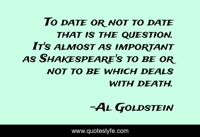 This page presents the quote "To date or not to date that is the question. It's almost as important as Shakespeare's to be or not to be which deals with death.". Author of this quote is Al Goldstein. This quote is about date, important, question,.