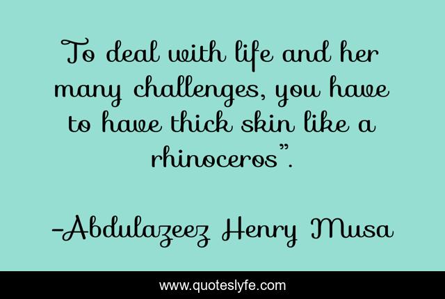 This page presents the quote "To deal with life and her many challenges, you have to have thick skin like a rhinoceros”.". Author of this quote is Abdulazeez Henry Musa. .