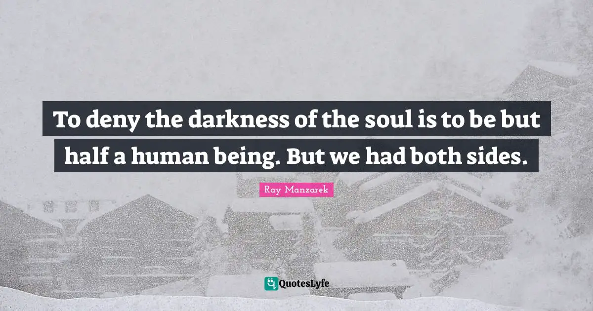 This page presents the quote "To deny the darkness of the soul is to be but half a human being. But we had both sides.". Author of this quote is Ray Manzarek. This quote is about soul, half, both sides, deny, darkness,.