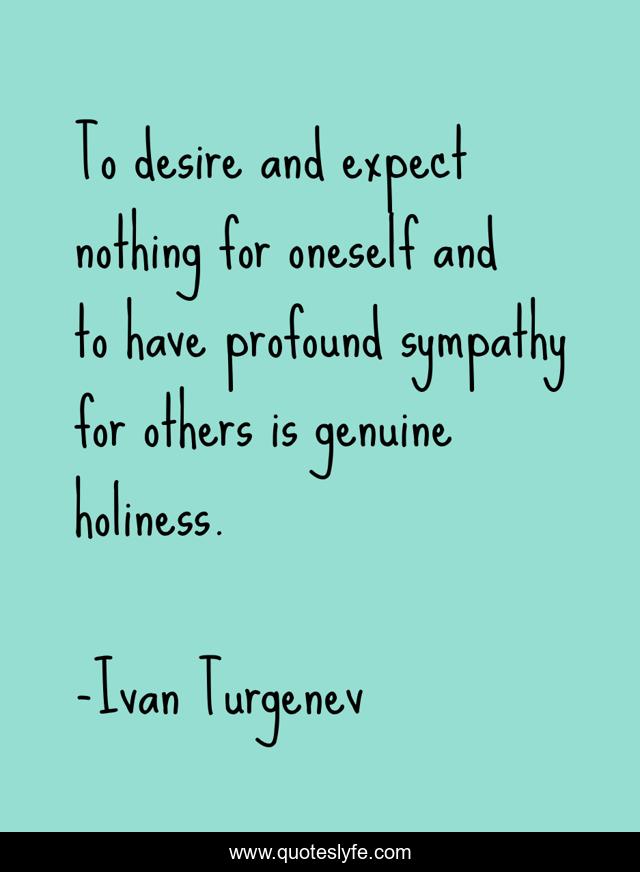 This page presents the quote "To desire and expect nothing for oneself and to have profound sympathy for others is genuine holiness.". Author of this quote is Ivan Turgenev. This quote is about desire, nothing, profound,.