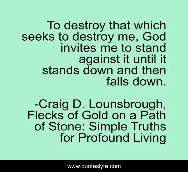 This page presents the quote "To destroy that which seeks to destroy me, God invites me to stand against it until it stands down and then falls down.". Author of this quote is Craig D. Lounsbrough, Flecks of Gold on a Path of Stone: Simple Truths for Profound Living. This quote is about god, challenge, intimidation, against, up, down, obstacle, stand, invitation,.