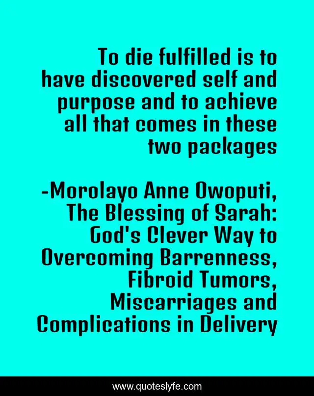 This page presents the quote "To die fulfilled is to have discovered self and purpose and to achieve all that comes in these two packages". Author of this quote is Morolayo Anne Owoputi, The Blessing of Sarah: God's Clever Way to Overcoming Barrenness, Fibroid Tumors, Miscarriages and Complications in Delivery. .