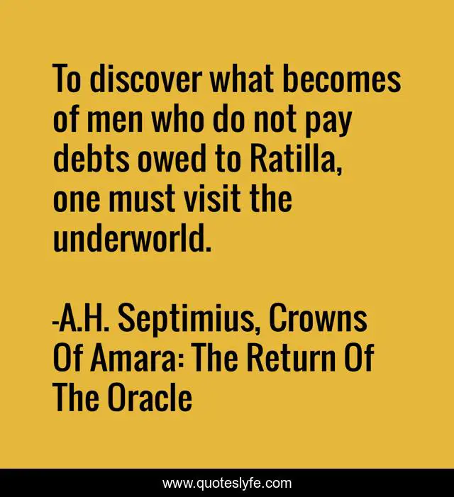 This page presents the quote "To discover what becomes of men who do not pay debts owed to Ratilla, one must visit the underworld.". Author of this quote is A.H. Septimius, Crowns Of Amara: The Return Of The Oracle. This quote is about gangsters, truth-of-life, crime,.