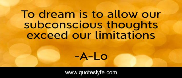 This page presents the quote "To dream is to allow our subconscious thoughts exceed our limitations". Author of this quote is A-Lo. This quote is about life, subconscious-mind-power, subconscious-mind, subconscious, dreamers, inspirational, dreaming, enthusiasm, life-and-living,.