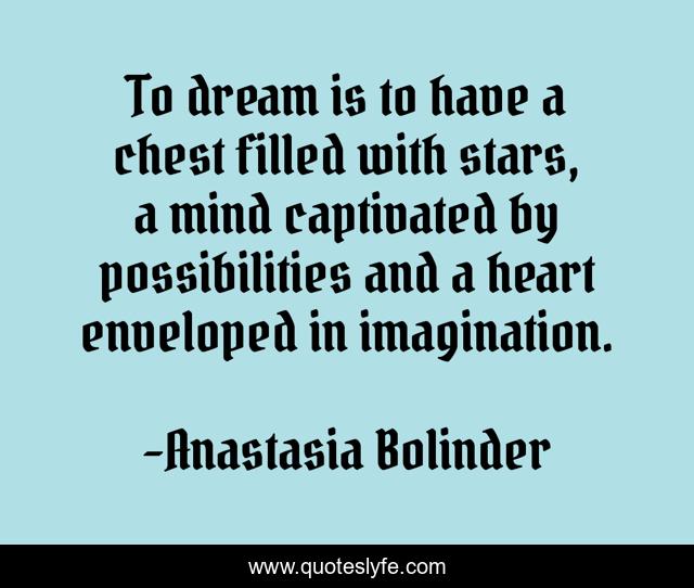 This page presents the quote "To dream is to have a chest filled with stars, a mind captivated by possibilities and a heart enveloped in imagination.". Author of this quote is Anastasia Bolinder. This quote is about dream-big, dream, inspired, dreaming, dreams-inspirational, dreamer,.