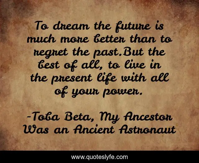 This page presents the quote "To dream the future is much more better than to regret the past.But the best of all, to live in the present life with all of your power.". Author of this quote is Toba Beta, My Ancestor Was an Ancient Astronaut. This quote is about past, life, future, dream, present,.