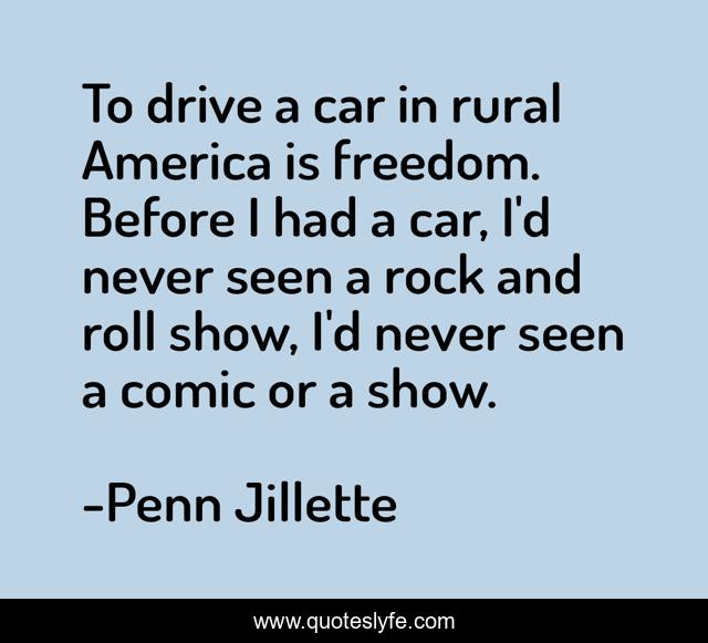 This page presents the quote "To drive a car in rural America is freedom. Before I had a car, I'd never seen a rock and roll show, I'd never seen a comic or a show.". Author of this quote is Penn Jillette. This quote is about freedom, america,.
