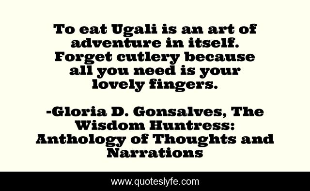 This page presents the quote "To eat Ugali is an art of adventure in itself. Forget cutlery because all you need is your lovely fingers.". Author of this quote is Gloria D. Gonsalves, The Wisdom Huntress: Anthology of Thoughts and Narrations. This quote is about quote, quotes,.
