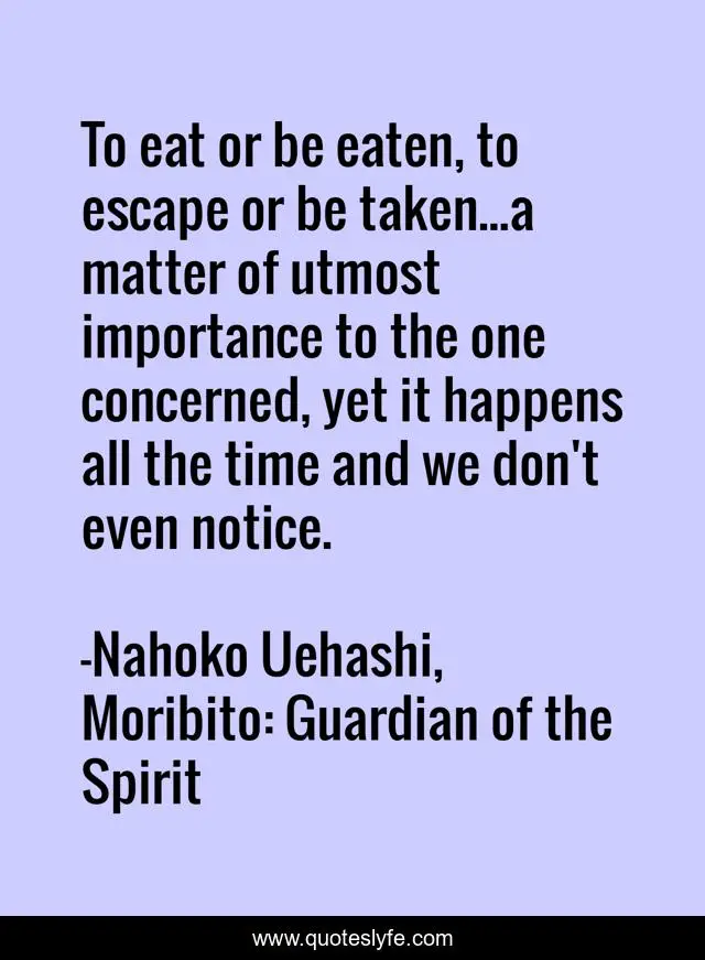 This page presents the quote "To eat or be eaten, to escape or be taken...a matter of utmost importance to the one concerned, yet it happens all the time and we don't even notice.". Author of this quote is Nahoko Uehashi, Moribito: Guardian of the Spirit. This quote is about survival, obliviousness, nature,.
