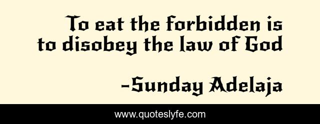 This page presents the quote "To eat the forbidden is to disobey the law of God". Author of this quote is Sunday Adelaja. This quote is about god, disobey, law-of-god, forbidden, law, eat,.