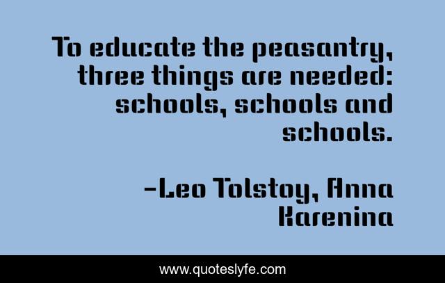 This page presents the quote "To educate the peasantry, three things are needed: schools, schools and schools.". Author of this quote is Leo Tolstoy, Anna Karenina. This quote is about schools, educate, education,.