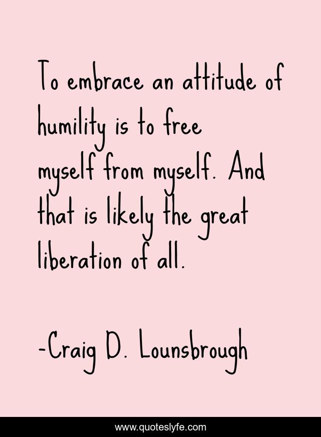 This page presents the quote "To embrace an attitude of humility is to free myself from myself. And that is likely the great liberation of all.". Author of this quote is Craig D. Lounsbrough. This quote is about selflessness, egocentric, freedom, self, humble, free, egotism, behaviour, liberation,.
