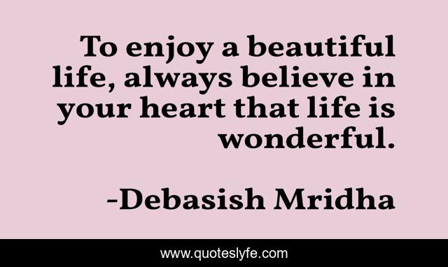 This page presents the quote "To enjoy a beautiful life, always believe in your heart that life is wonderful.". Author of this quote is Debasish Mridha. This quote is about life-is-wonderful, enjoy-a-beautiful-life, philosophy, debasish-mridha, believe-in-your-heart, quotes, debasish-mridha-md, inspirational, enthusiasm,.