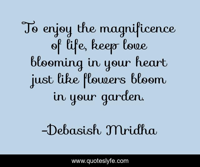 This page presents the quote "To enjoy the magnificence of life, keep love blooming in your heart just like flowers bloom in your garden.". Author of this quote is Debasish Mridha. This quote is about flowers-bloom-in-your-garden, enjoy-life, philosophy, debasish-mridha, keep-love-blooming, quotes, debasish-mridha-md, inspirational, enthusiasm,.