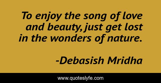 This page presents the quote "To enjoy the song of love and beauty, just get lost in the wonders of nature.". Author of this quote is Debasish Mridha. This quote is about love, beauty, nature, philosophy, debasish-mridha, quotes, wonder-of-nature, inspirational, enthusiasm,.