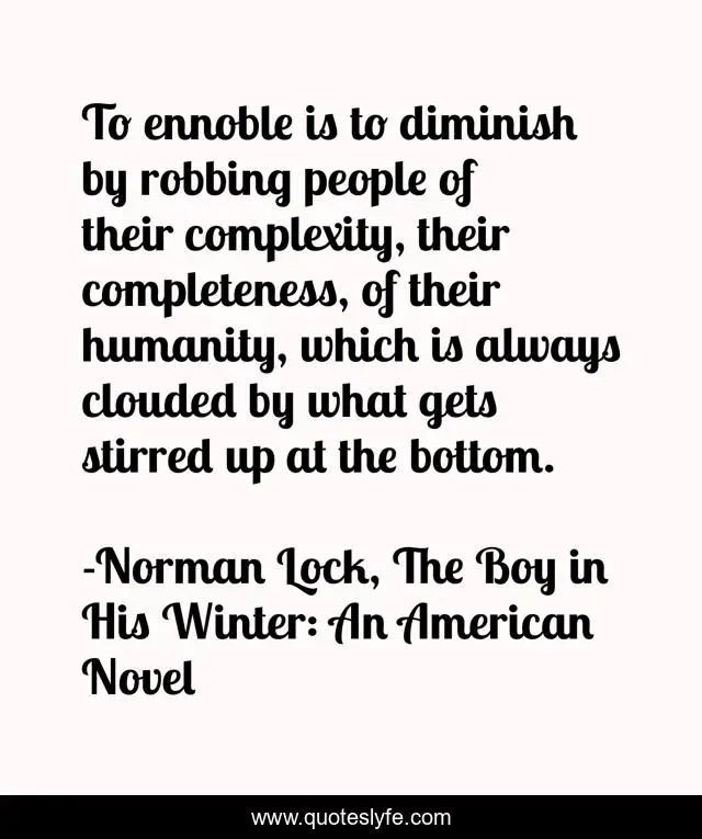 This page presents the quote "To ennoble is to diminish by robbing people of their complexity, their completeness, of their humanity, which is always clouded by what gets stirred up at the bottom.". Author of this quote is Norman Lock, The Boy in His Winter: An American Novel. This quote is about human-nature, huck-finn, nostalgie-de-la-boue, false-nobility, literary-character-appropriation,.