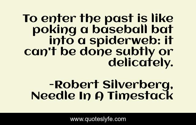 This page presents the quote "To enter the past is like poking a baseball bat into a spiderweb: it can't be done subtly or delicately.". Author of this quote is Robert Silverberg, Needle In A Timestack. .