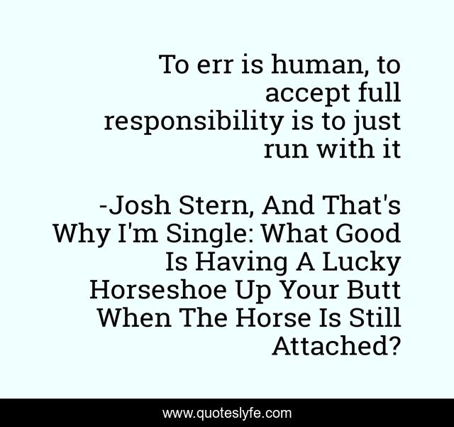 This page presents the quote "To err is human, to accept full responsibility is to just run with it". Author of this quote is Josh Stern, And That's Why I'm Single: What Good Is Having A Lucky Horseshoe Up Your Butt When The Horse Is Still Attached?. This quote is about humor, err, responsibility, absurd, human,.