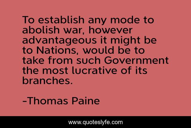 This page presents the quote "To establish any mode to abolish war, however advantageous it might be to Nations, would be to take from such Government the most lucrative of its branches.". Author of this quote is Thomas Paine. This quote is about government, nations,.