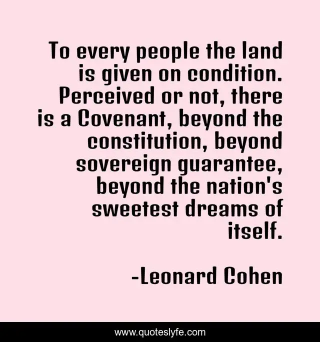This page presents the quote "To every people the land is given on condition. Perceived or not, there is a Covenant, beyond the constitution, beyond sovereign guarantee, beyond the nation's sweetest dreams of itself.". Author of this quote is Leonard Cohen. This quote is about people, constitution, nation,.