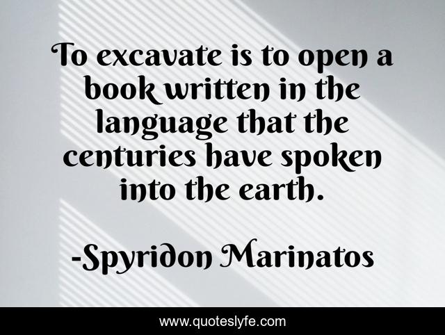 This page presents the quote "To excavate is to open a book written in the language that the centuries have spoken into the earth.". Author of this quote is Spyridon Marinatos. This quote is about language, archeologist, excavation, archeology, culture, earth-s-history, science, earth, discovery,.
