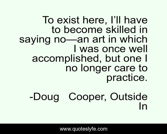 This page presents the quote "To exist here, I’ll have to become skilled in saying no—an art in which I was once well accomplished, but one I no longer care to practice.". Author of this quote is Doug Cooper, Outside In. This quote is about art, practice, saying-no, say-no, outside-in, identity, to-exist,.