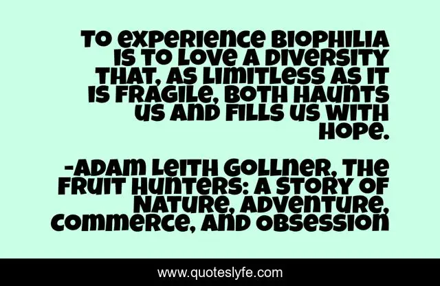 "Adam Leith Gollner, The Fruit Hunters: A Story of Nature, Adventure, Commerce, and Obsession Quotes." Quoteslyfe.com, 2025. Tue. 09 Dec. 2025. <https://www.quoteslyfe.com/quote/To-experience-biophilia-is-to-love-a-167977>.